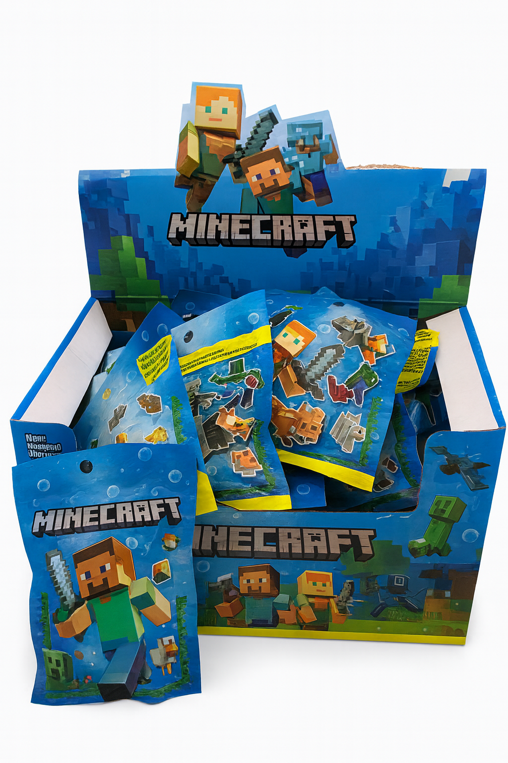 Set complet de 24 plicuri surpriza cu figurine inspirate din lumea aventurilor pixelate, ideale pentru copii si colectionari. Fiecare plic contine o mica figurina in stil cubic, reprezentand personaje, animale sau obiecte de explorare. Ambalajul este colorat, atractiv si conceput pentru a se vinde rapid la bucata.