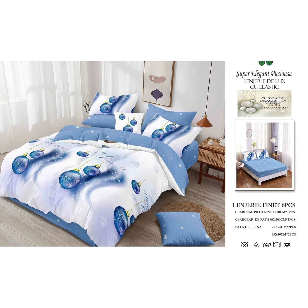 Adauga un aer festiv si elegant dormitorului cu aceasta lenjerie de pat din finet premium, 6 piese, decorata cu globuri albastre si fulgi de nea, in nuante moderne de alb si albastru. Materialul finet este moale, placut la atingere si ideal pentru sezonul rece, oferind confort si caldura pe tot parcursul noptii.