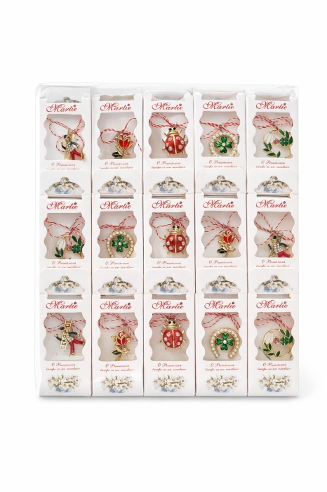 Martisorul este realizat sub forma de brosa metalica decorativa, cu finisaje atent lucrate si modele variate inspirate din simboluri traditionale de primavara, precum flori, trifoi, buburuze sau elemente norocoase. Fiecare piesa este prevazuta cu snur alb-rosu, pastrand semnificatia clasica a Martisorului.