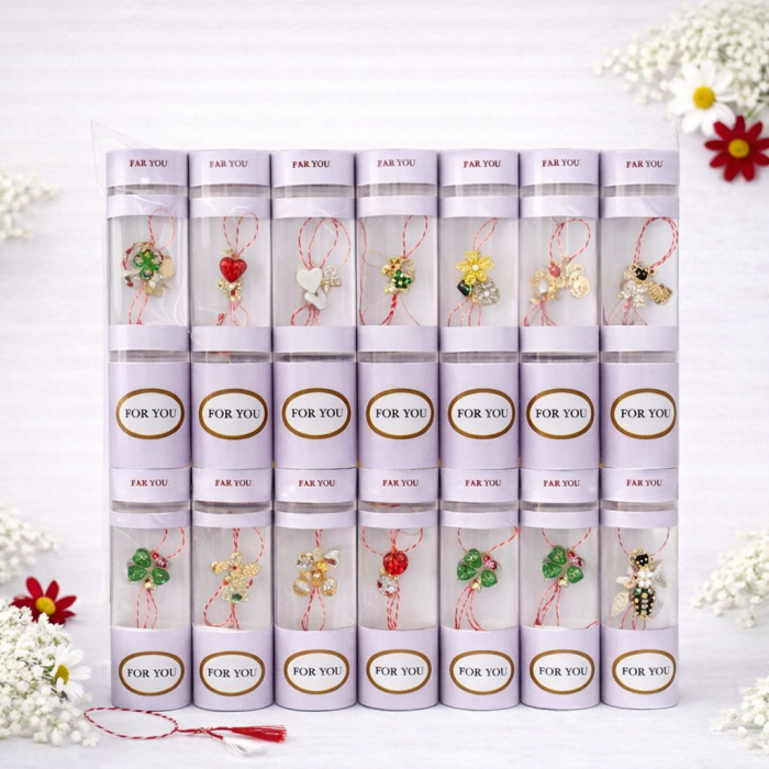 Brosele sunt prevazute cu snur traditional alb-rosu si sistem de prindere tip brosa, fiind potrivite pentru purtare pe haine, sacouri, paltoane, esarfe sau genti. Fiecare martisor este ambalat individual in tub elegant, cu design modern si mesaj decorativ, oferind o prezentare premium, ideala pentru a fi oferita direct cadou, fara ambalare suplimentara.