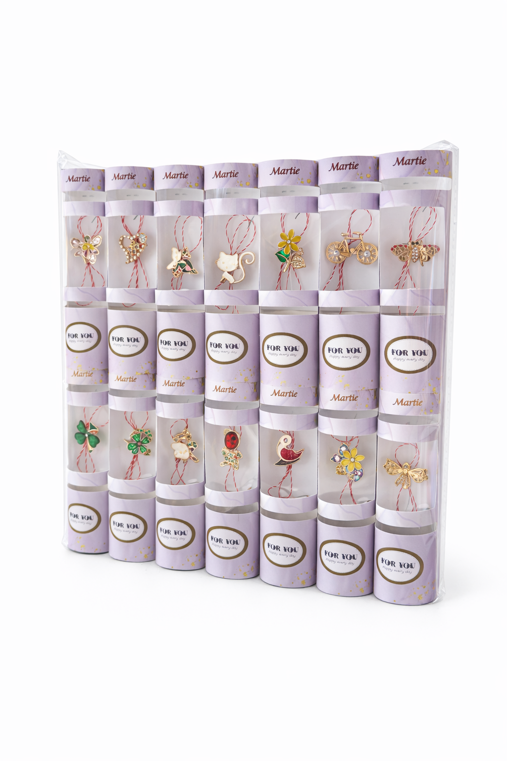 Dimensiunea fiecarui martisor ambalat este de 14 x 7 cm, ceea ce il face usor de manevrat si de oferit in cadrul firmelor, institutiilor, colectivelor mici sau evenimentelor private. Setul este potrivit pentru a fi oferit colegilor, angajatilor, profesorilor sau persoanelor apropiate, reprezentand un gest simbolic si elegant la inceput de primavara.