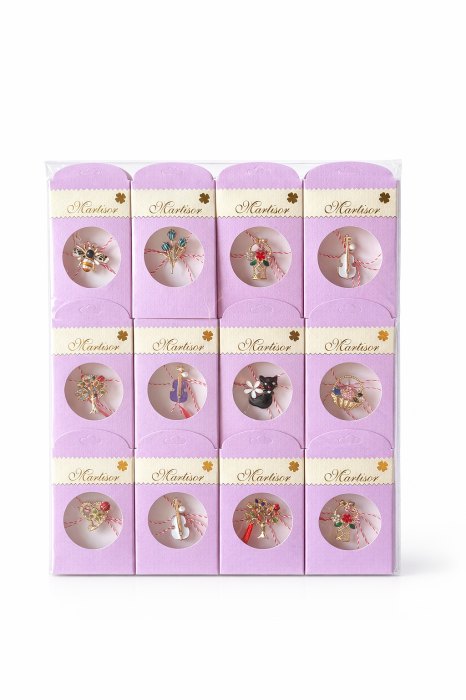 Setul contine 24 de brose martisor metalice, realizate cu atentie la detalii si finisaje, avand modele variate inspirate din simboluri clasice de primavara precum flori, trifoi, fluturi, animale sau elemente decorative elegante. Designul divers face ca fiecare brosa sa fie atractiva si potrivita pentru diferite gusturi.