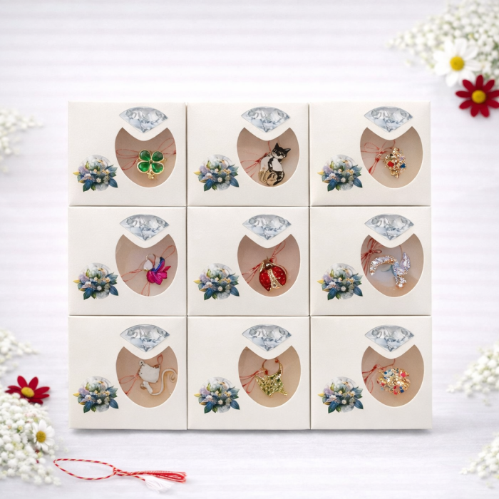 Setul contine 24 brose martisor cu modele combinate, fiecare piesa fiind ambalata individual intr-un ambalaj specific martisorului, atent decorat. Snurul traditional alb rosu este prezent la fiecare brosa si simbolizeaza primavara, norocul, protectia si reinnoirea, fiind oferit ca gest de apreciere si ganduri bune.