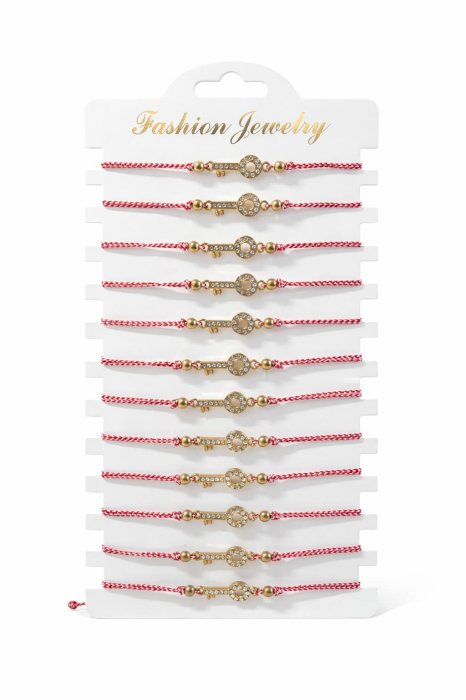 Acest set de 12 bratari martisor este decorat cu un simbol elegant si plin de semnificatie – cheia aurie cu strasuri stralucitoare, realizata cu finisaje delicate si montata pe snur traditional de martisor alb cu rosu, impletit si reglabil. Bratarile sunt prezentate pe card tip display, cu dimensiunea de aproximativ 20 x 11 cm, fiind ideale pentru oferirea martisoarelor intr-un mod ordonat si atractiv.