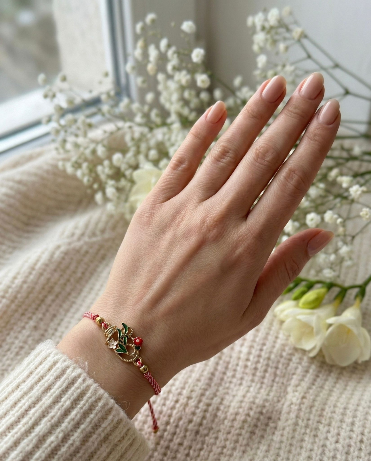 Snurul alb-rosu, specific traditiei martisorului, simbolizeaza echilibrul dintre puritate si vitalitate. Albul reprezinta lumina, sinceritatea si inceputurile curate, iar rosul semnifica viata, sanatatea si forta regeneratoare a primaverii. Aceasta combinatie pastreaza traditia vie, integrata armonios intr-un accesoriu modern.