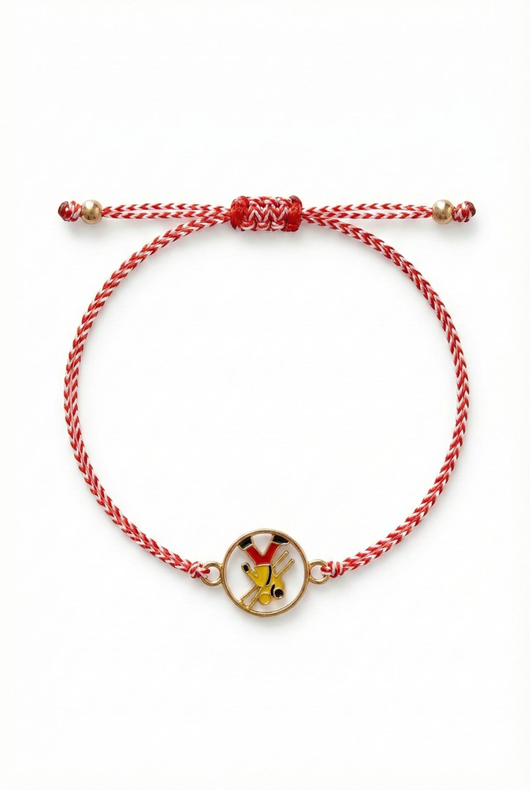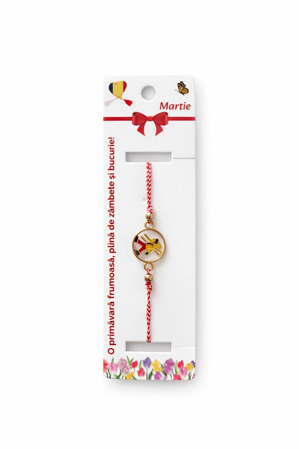 Fiecare bratara este realizata pe snur impletit rosu si alb, reglabil, adaptabil oricarei incheieturi. Elementul central este un cosar norocos stilizat, realizat cu finisaj auriu si detalii atent lucrate, simbol traditional al norocului, prosperitatii si inceputurilor bune. Cosarul este asociat cu succesul, energia pozitiva si protectia, fiind un simbol indragit in traditia martisorului.
