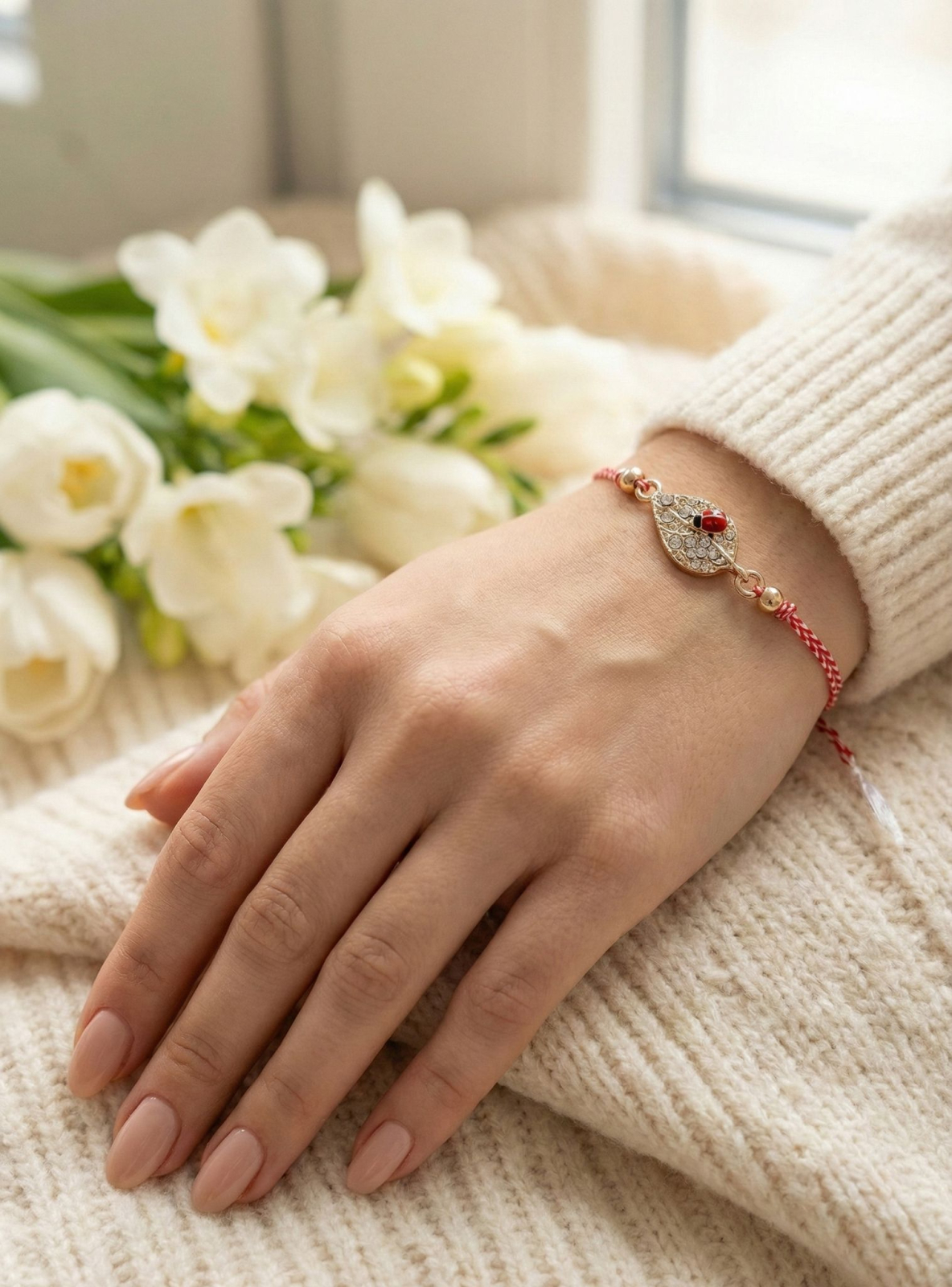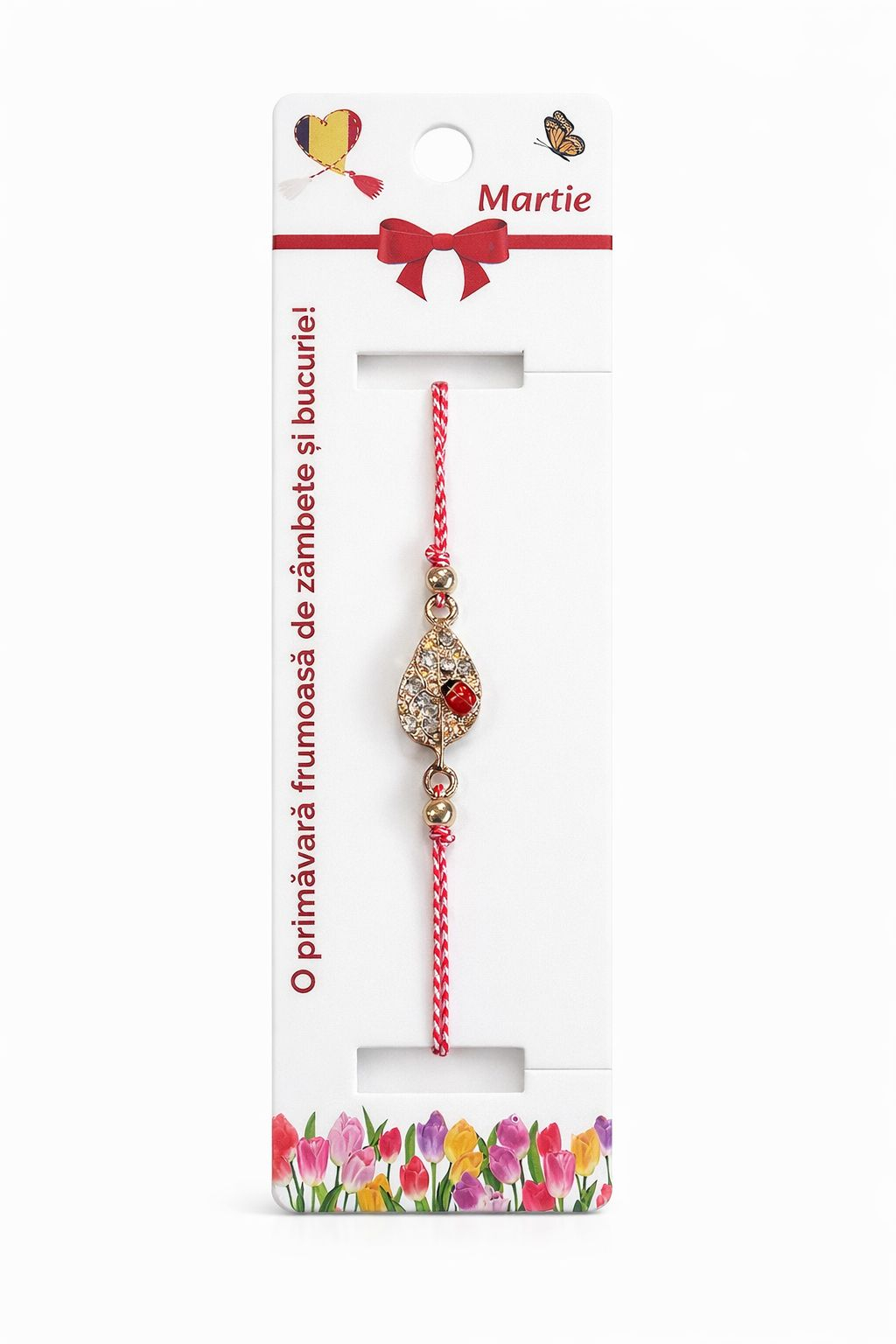 Fiecare bratara este realizata pe snur impletit rosu si alb, reglabil, adaptabil oricarei incheieturi. Elementul central este o frunza stilizata cu finisaj auriu, decorata cu strasuri fine si completata de un detaliu buburuza. Frunza simbolizeaza renasterea, cresterea si legatura cu natura, iar buburuza este un simbol traditional al norocului, protectiei si energiei pozitive.