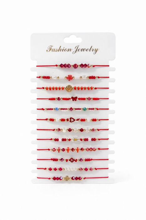 Acest set de 12 bratari martisor este conceput pentru a aduce culoare, veselie si energie pozitiva la inceputul primaverii, imbinand traditia martisorului cu un design modern si variat. Fiecare bratara este realizata cu snur rosu reglabil, decorat cu margele decorative in nuante armonioase de rosu, alb, auriu si accente colorate. Dimensiunea setului este de aproximativ 20 x 11 cm.