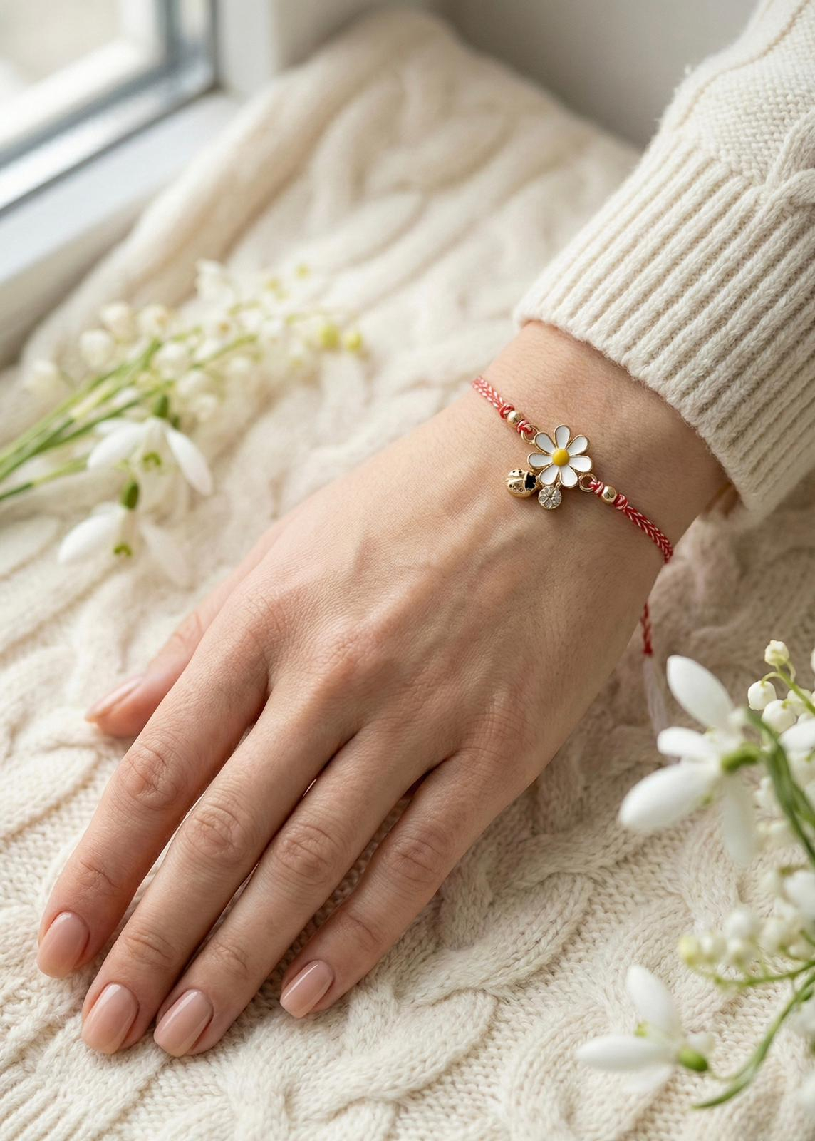 Fiecare bratara este realizata cu snur impletit rosu si alb, reglabil, usor de adaptat pe diferite dimensiuni ale incheieturii. Elementul central este o margareta decorativa, cu petale fine si detalii atent finisate, completata de mici accesorii metalice care adauga un plus de eleganta si rafinament. Sistemul de ajustare permite purtarea confortabila, bratara putand fi folosita atat ca martisor, cat si ca accesoriu discret de zi cu zi.