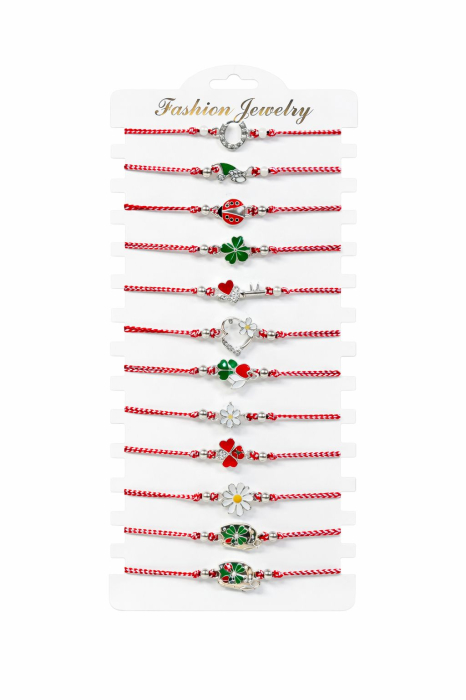 Acest set de 12 bratari martisor imbina armonios traditia romaneasca a martisorului cu simboluri clasice de primavara, avand un design elegant si echilibrat. Fiecare bratara este realizata cu snur rosu reglabil, usor de ajustat pentru orice dimensiune a incheieturii, si este decorata cu simboluri argintii atent alese, inspirate din specificul martisorului. Dimensiunea setului este de aproximativ 20 x 11 cm.