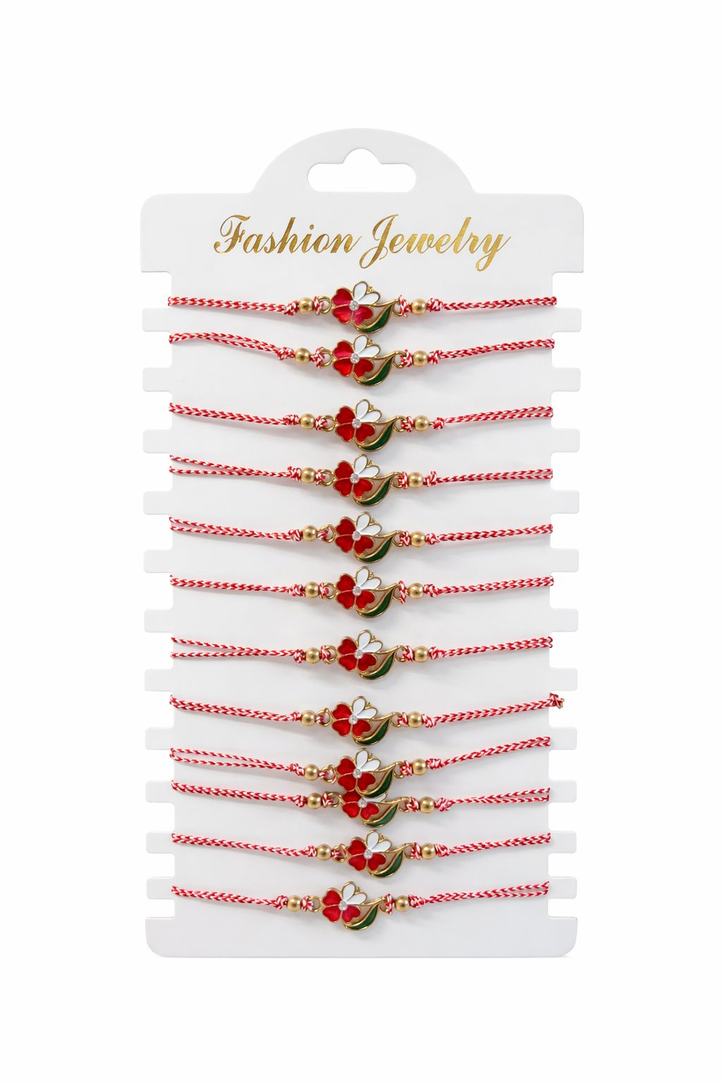 Acest set de 12 bratari martisor are ca element central trifoiul auriu decorat cu strasuri fine, un simbol clasic al norocului, prosperitatii si energiei pozitive. Bratarile sunt realizate cu snur rosu impletit, reglabil, accesorizat cu bilute aurii, iar dimensiunea setului este de aproximativ 20 x 11 cm.