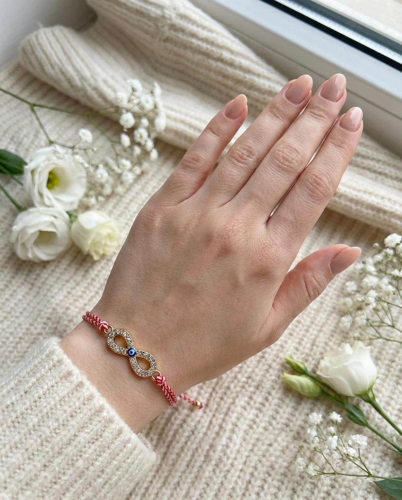 Fiecare bratara este decorata cu simbolul infinit auriu, accesorizat cu pietricele stralucitoare si ochisor protector central. Simbolul infinitului reprezinta continuitatea, legaturile fara sfarsit si armonia, fiind asociat cu iubirea eterna si stabilitatea. Ochiul protector este cunoscut ca simbol impotriva energiilor negative, aducand protectie, noroc si liniste celui care il poarta.