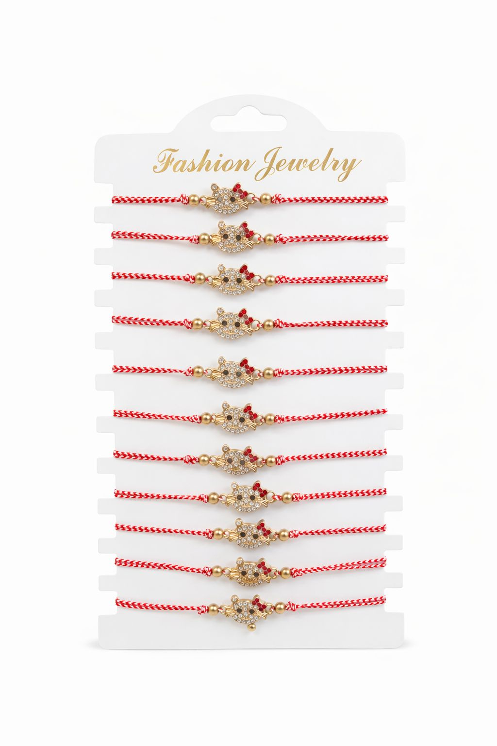 Acest set de 12 bratari martisor este decorat cu un simbol elegant si indragit – pisicuta aurie cu strasuri stralucitoare, realizata cu detalii fine, montata pe snur traditional de martisor alb cu rosu, impletit si reglabil. Bratarile sunt aranjate pe card tip display, cu dimensiunea de aproximativ 20 x 11 cm, fiind ideale pentru oferirea martisoarelor intr-un mod organizat si estetic.