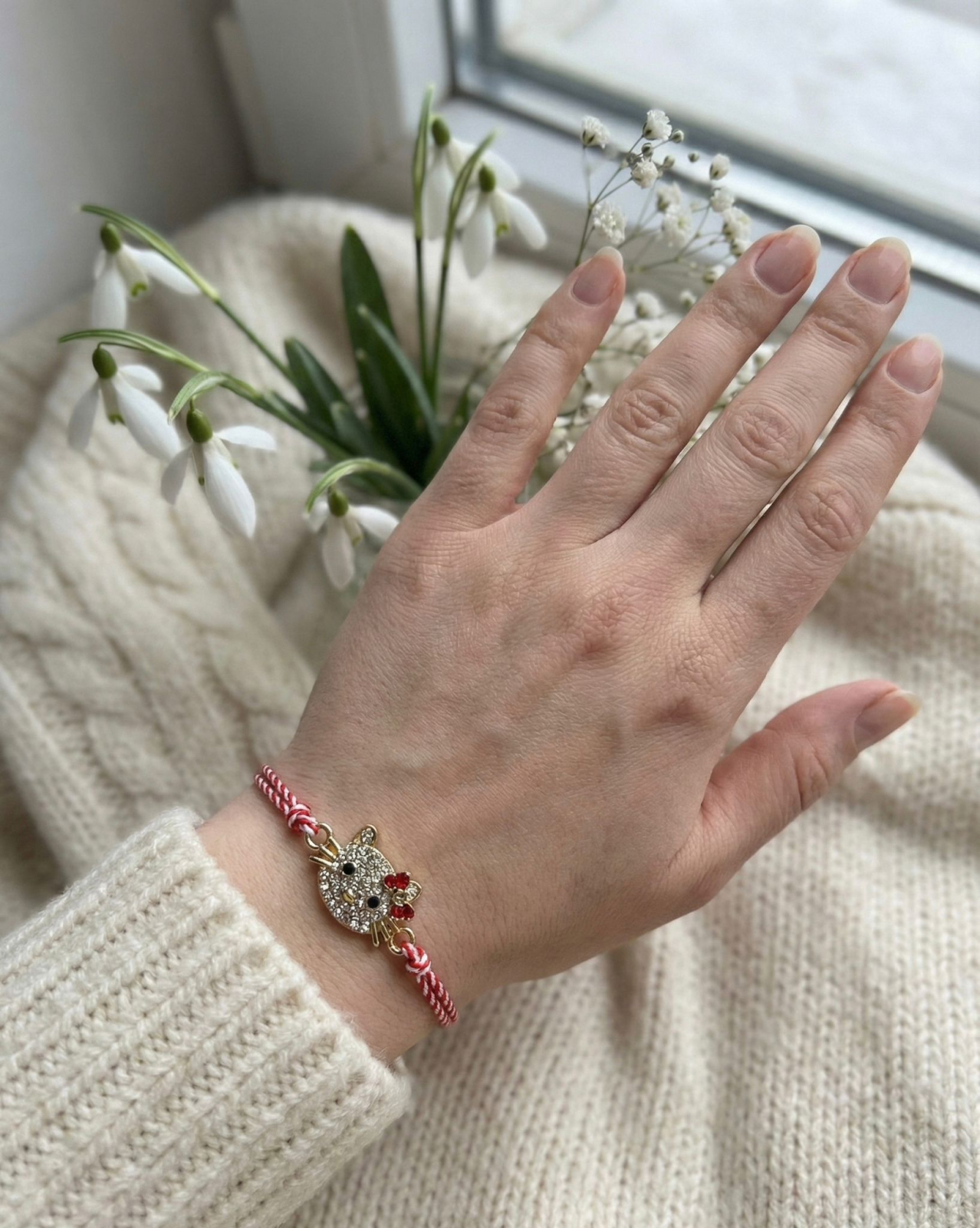 Snurul alb-rosu pastreaza simbolistica traditionala a martisorului: albul reprezinta puritatea, echilibrul si inceputurile curate, in timp ce rosul simbolizeaza viata, sanatatea, dragostea si forta primaverii. Aceasta combinatie clasica ofera bratarii o semnificatie profunda, pastrand legatura cu traditia romaneasca.