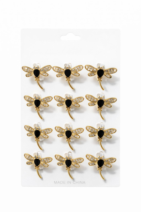 Acest set de 12 brose martisor cu libelula aurie este un simbol al schimbarii, adaptabilitatii si claritatii interioare, oferit la inceput de primavara ca mesaj de evolutie si energie pozitiva. Libelula este asociata cu transformarea si puterea de a vedea lucrurile cu intelepciune, fiind un martisor cu semnificatie profunda si moderna. Modelul individual se remarca prin finisajul auriu rafinat, aripi decorate cu strasuri stralucitoare si element central contrastant, care adauga eleganta si distinctie. Designul delicat face ca fiecare brosa sa fie usor de purtat pe haine sau accesorii, fiind potrivita pentru toate varstele. Setul este ideal pentru oferire individuala de 1 Martie, cadouri simbolice sau vanzare sezoniera cu aspect elegant si mesaj pozitiv.