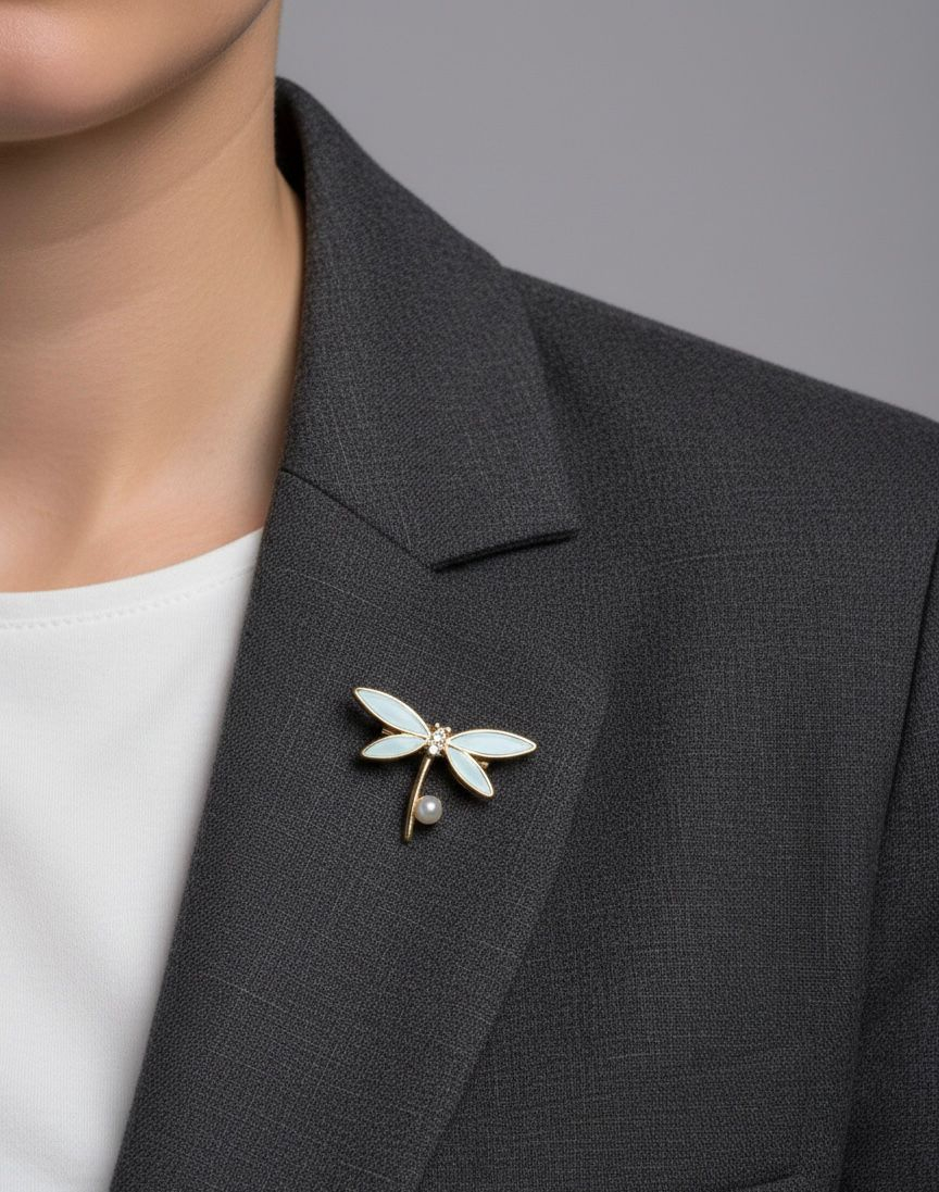 Broselor au un design delicat si modern, realizate in ton auriu, cu aripi emailate in culori variate (rosu, negru, bleu, roz, crem) si perluta decorativa aplicata in partea inferioara, oferind un aspect elegant si feminin. Modelele sunt combinate pe acelasi card, adaugand diversitate si atractivitate setului.