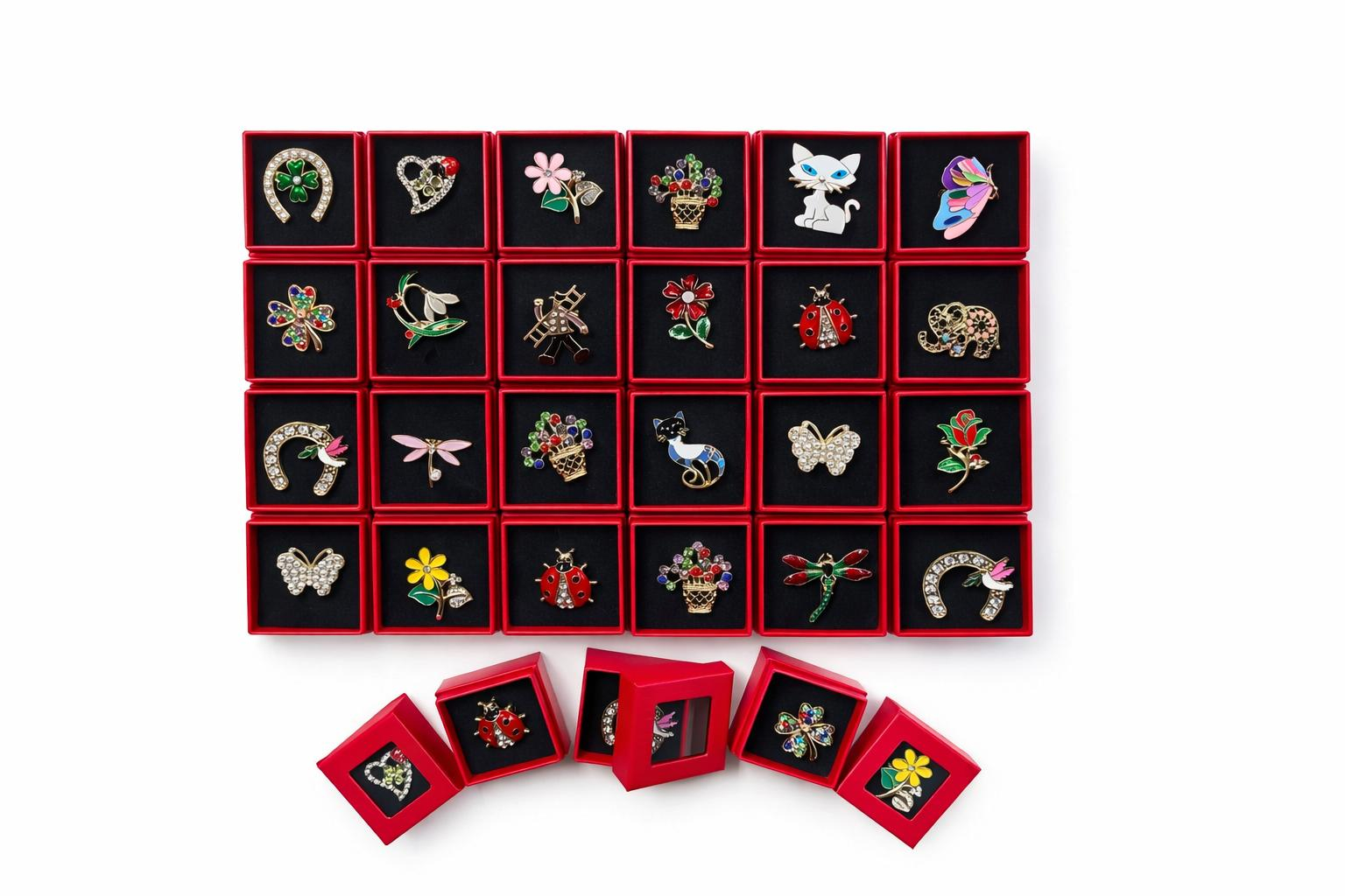 Set de 24 broșe decorative, fiecare ambalată în cutiuță roșie 4x4 cm cu interior negru. Modele variate: fluturi, pisici, buburuze, potcoave, flori, coșuri și alte simboluri vesele, decorate cu email colorat și pietricele strălucitoare. Ideal ca martisor elegant, cadou primavara pentru 1 martie, Ziua Femeii sau alte ocazii speciale. Broșe cu personalitate — un mix de stil, culoare și simboluri norocoase.