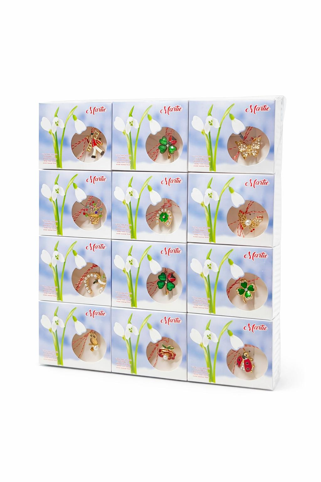 Setul contine 24 brose martisor cu modele combinate, fiecare brosa fiind ambalata individual intr-un ambalaj specific martisorului, decorativ si atent finisat. Snurul traditional alb rosu este prezent la fiecare piesa si simbolizeaza primavara, echilibrul, norocul si protectia, fiind un element esential al traditiei de 1 Martie.