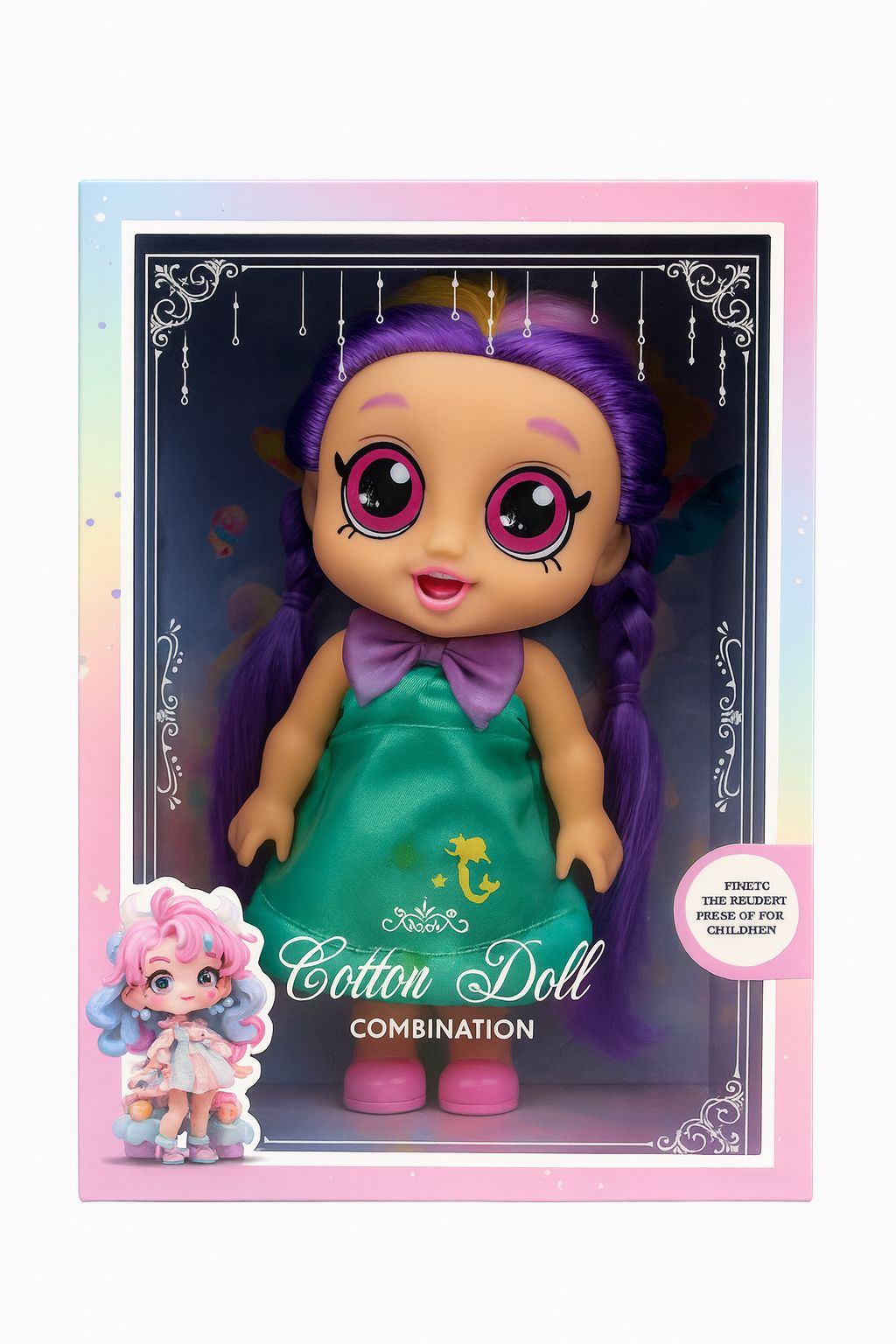 Papusa Cotton Doll este creata special pentru fetitele care iubesc personajele colorate si pline de farmec. Cu ochii mari, expresivi si parul mov impletit, papusa ofera ore intregi de joaca plina de imaginatie.