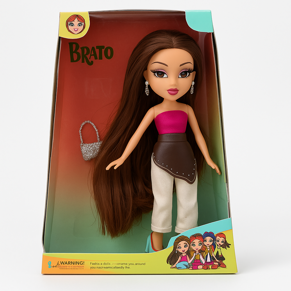 Papusa Brato Fashion impresionează prin eleganță și simplitate modernă! Cu o bustieră roz vibrant, pantaloni deschiși la culoare și o fustă tip accesoriu în talie, papusa adoptă un look trendy, inspirat din moda urbană. Parul ei extrem de lung, castaniu și drept, este perfect pentru coafuri spectaculoase și joc de rol creativ.