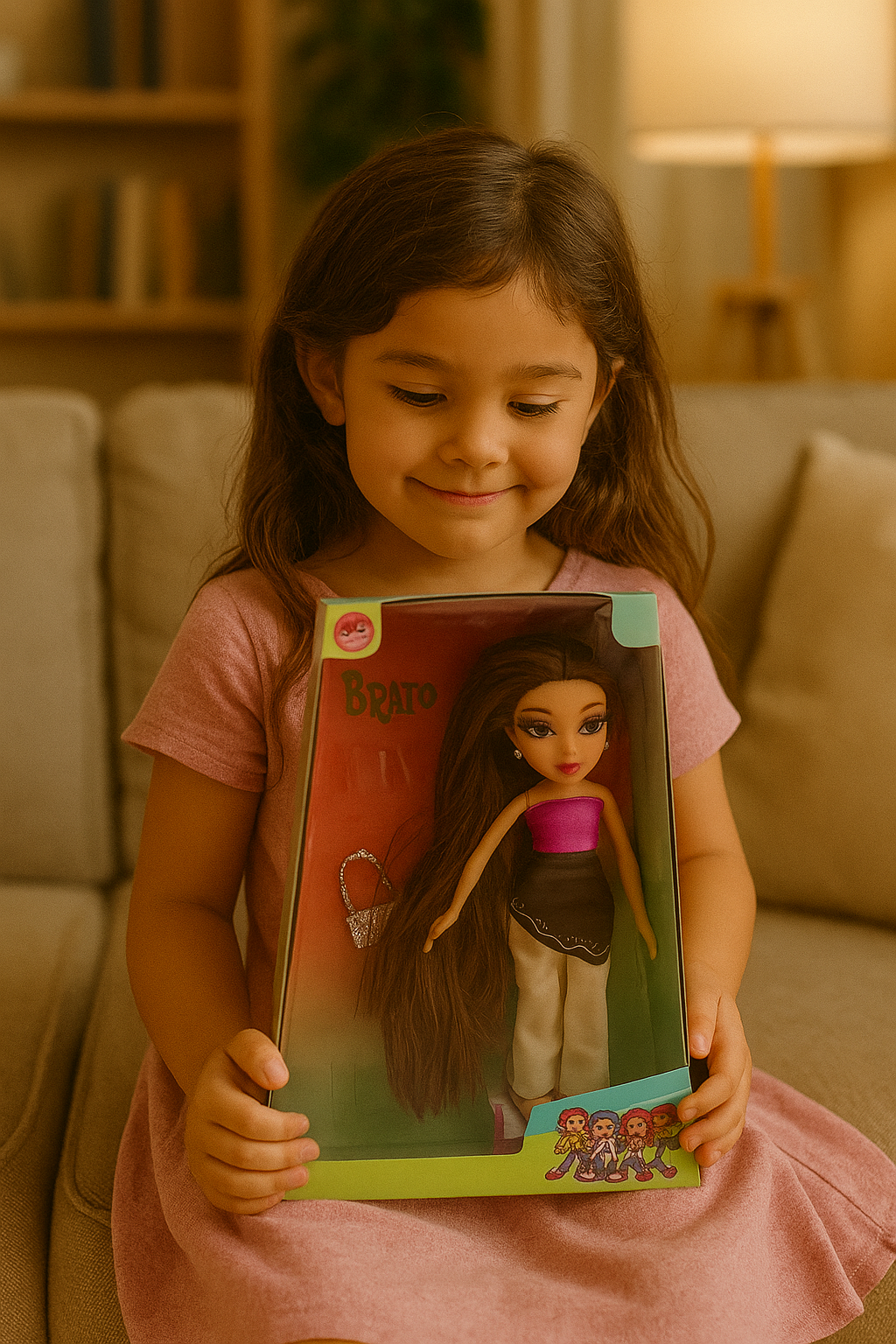 Recomandată pentru fete de 3+ ani, papusa Brato stimulează imaginația, stilul personal și îndemânarea prin coafat și asortat accesorii.