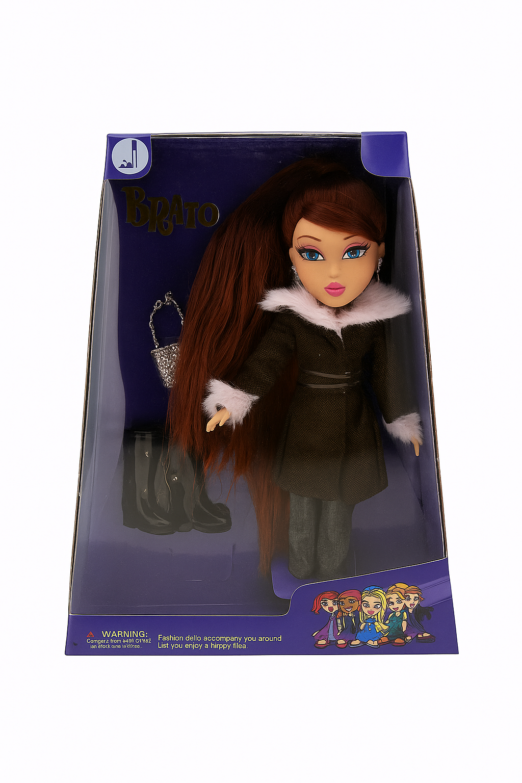 Papusa Brato Fashion se remarcă prin eleganța unei ținute perfecte pentru sezonul rece! Poartă un palton modern, cu guler și manșete pufoase, care îi oferă un look sofisticat și călduros. Parul ei extrem de lung, saten bogat, este ideal pentru coafuri creative și ore întregi de joacă.