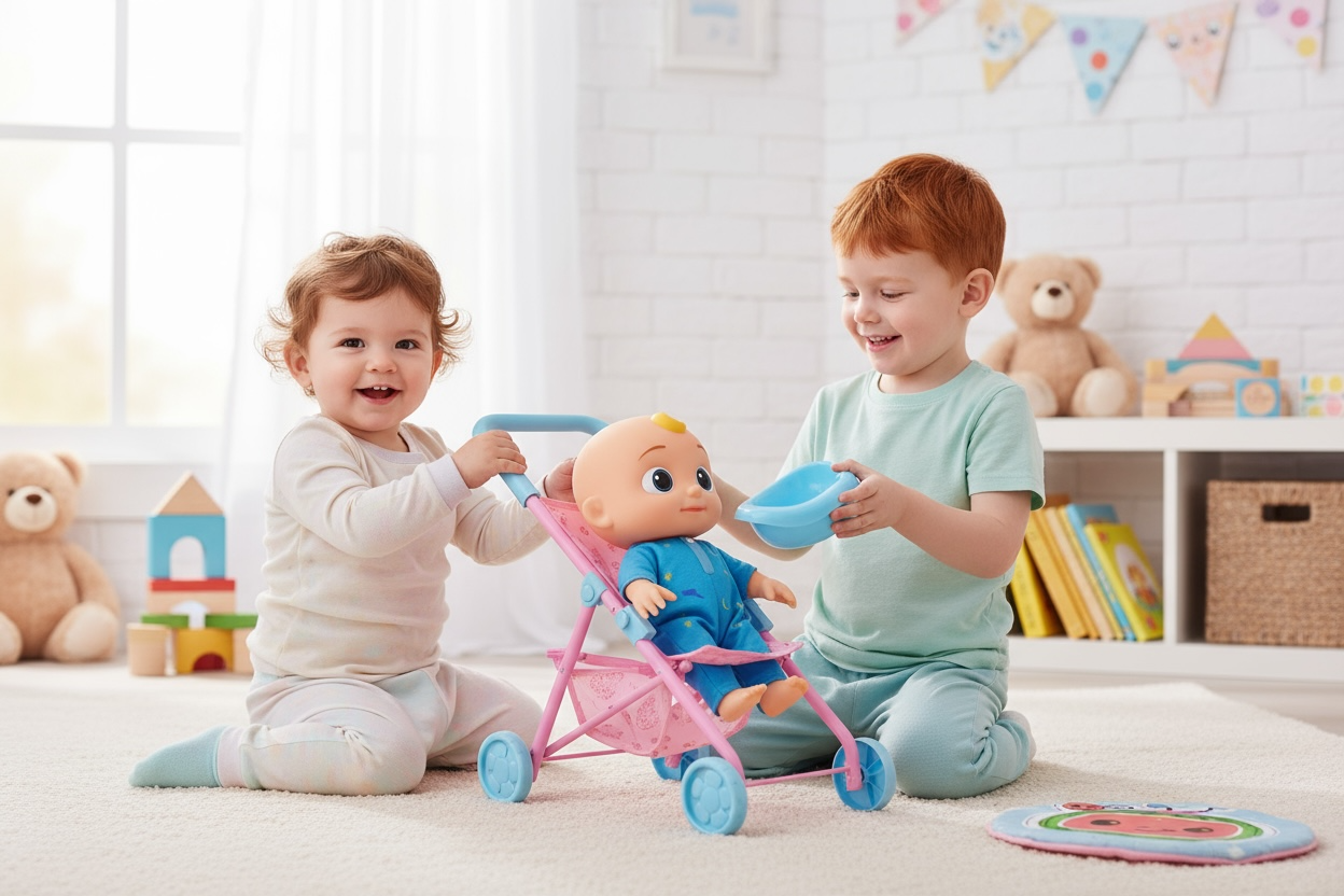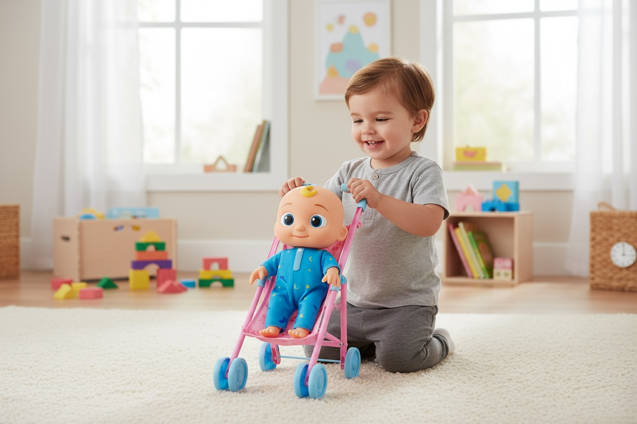 Transforma joaca zilnica intr-o experienta educativa si distractiva cu setul CoComelon dedicat celor mici! Acest set complet il include pe indragitul JJ imbracat in pijamale albastre cu stelute, alaturi de un carucior roz pliabil si o olita practica – ideale pentru joc de rol si scenarii de ingrijire.