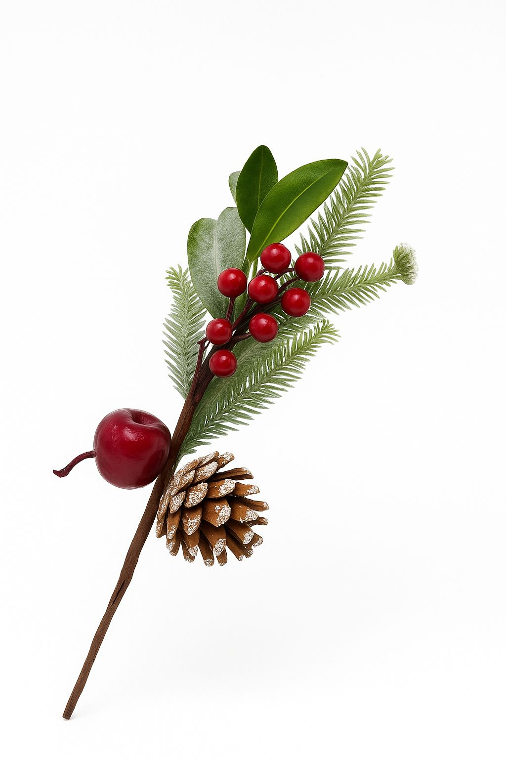 Ramura decorativa de Craciun este accesoriul perfect pentru aranjamente festive, brad, coronite sau proiecte DIY. Designul combină elemente naturale precum conul de pin cu zapada artificiala, frunze verzi, boabe rosii lucioase si un mar decorativ, oferind un aspect autentic de iarna.