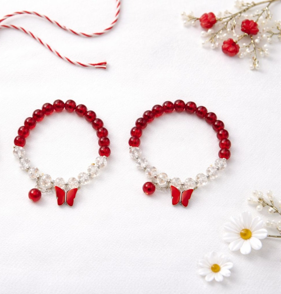 Setul contine 12 bratari martisor realizate din margele tip cristal in culorile alb si rosu, completate de un simbol decorativ in forma de fluturas rosu. Fiecare bratara este elastica, usor de purtat si potrivita pentru diferite dimensiuni ale incheieturii, fiind confortabila si practica. Bratarile sunt compuse din 14 bile rosii, 9 bile incolore si 10 bilute mici metalice argintii, care ofera un aspect elegant si echilibrat.