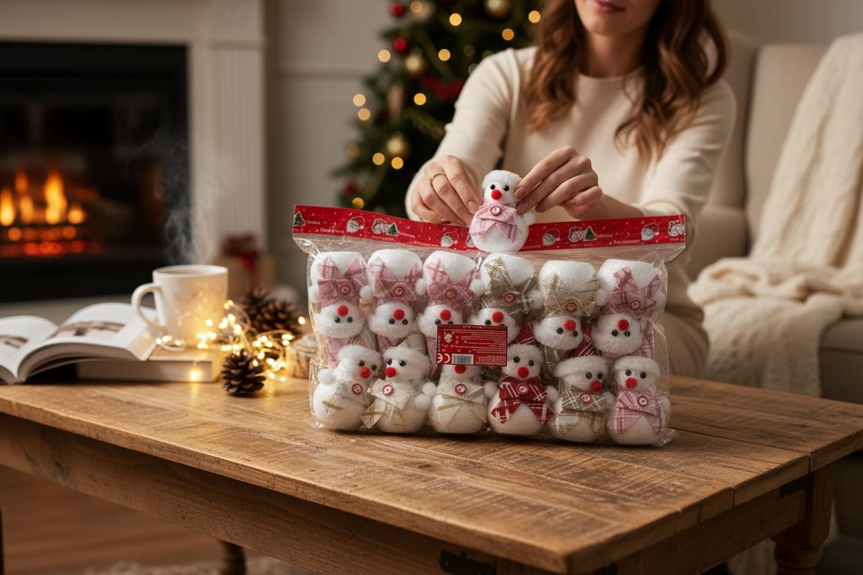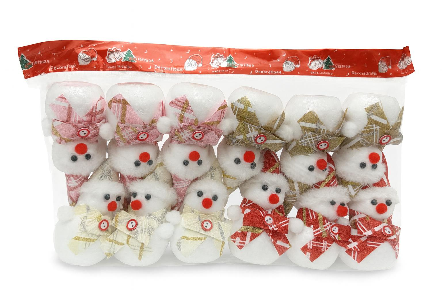Set de decoratiuni festive sub forma de om de zapada, realizate din materiale usoare si pufoase, ideale pentru brad, coronite sau aranjamente tematice. Pachetul contine mai multe figurine in culori si modele diferite, cu fulare si caciuli din textile decorative.