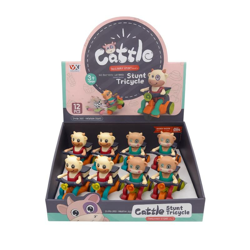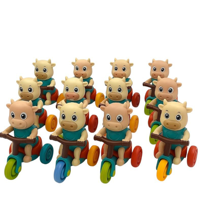 Set de 12 jucării mecanice vițeluș pe tricicletă, care pornesc prin tragere înapoi și se rostogolesc amuzant pe orice suprafață. Ideal pentru copii 3+ ani, petreceri, cadouri și recompense, acest set colorat stimulează imaginația, jocul de rol și coordonarea mână-ochi a celor mici, fără a fi nevoie de baterii.