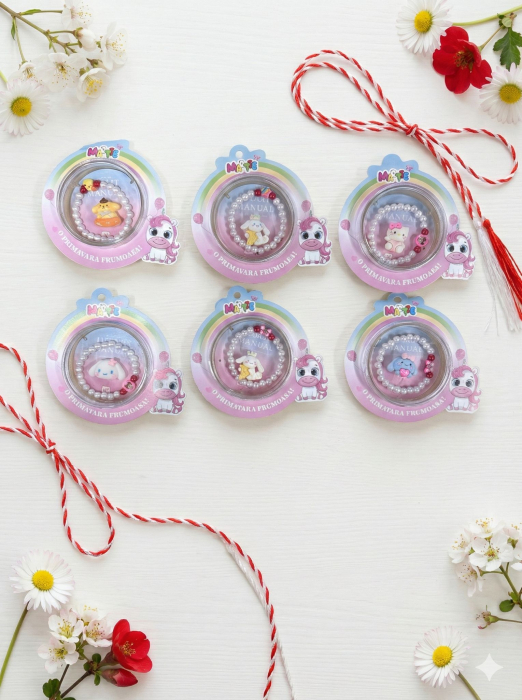 Set de martisoare pentru fetite compus din bratara si brosa, realizat cu figurine vesele si colorate, special concepute pentru a aduce bucurie la inceput de primavara. Bratara este realizata din perlute delicate si este accesorizata cu un simbol decorativ colorat, oferind un aspect jucaus si atragator.