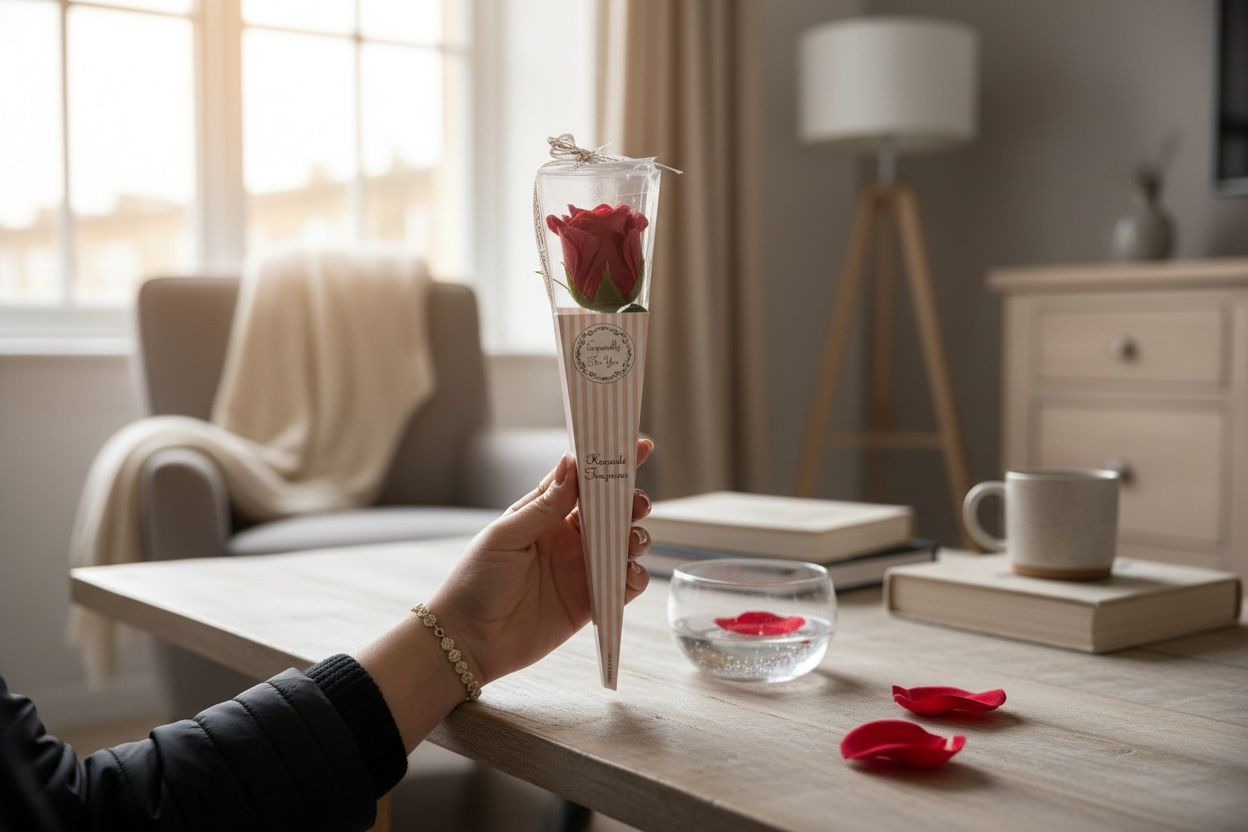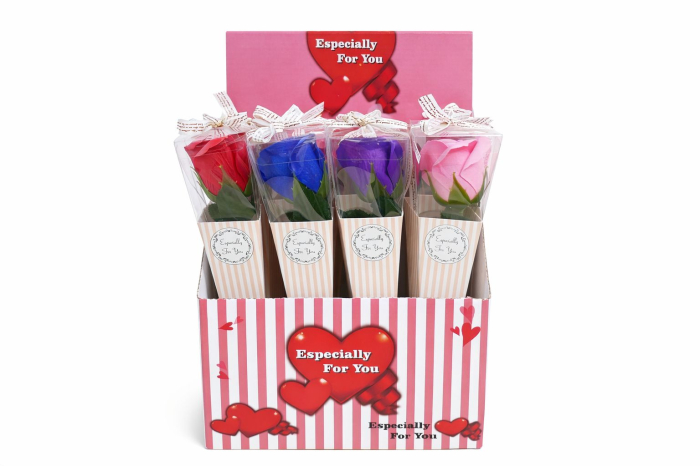 Set elegant de 12 trandafiri artificiali , creat pentru a impresiona prin aspect si delicatete. Fiecare trandafir este usor parfumat si ambalat individual intr-un con din carton, acoperit cu plastic transparent si decorat cu fundita, oferind un aer rafinat si potrivit pentru cadouri. Trandafirii sunt in culori mixte, iar nuantele pot varia, contribuind la un efect vizual placut si divers. Dimensiunile setului sunt de aproximativ 33 x 22 x 16 cm, iar fiecare trandafir ambalat masoara aproximativ 29 x 5 x 5 cm. Este o alegere ideala pentru aniversari, evenimente speciale, decor sau mici atentii elegante, combinand frumusetea florilor cu utilitatea si parfumul discret al sapunului.