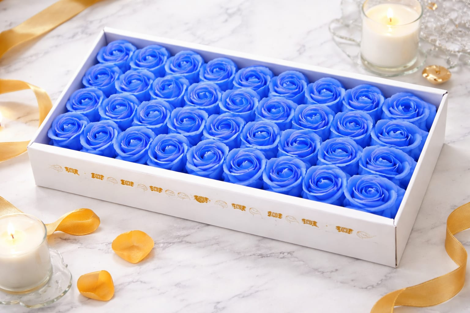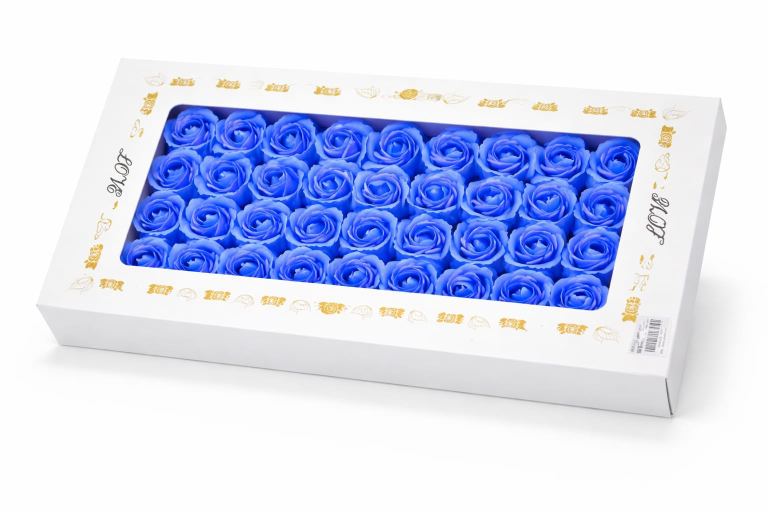 Setul este alcatuit din 50 de trandafiri de sapun parfumati, aranjati uniform intr-o cutie dreptunghiulara eleganta, potrivita pentru a fi oferita cadou. Trandafirii au un aspect realist si o culoare albastru indigo intensa, eleganta si sofisticata, ideala pentru cadouri rafinate si decoruri moderne.