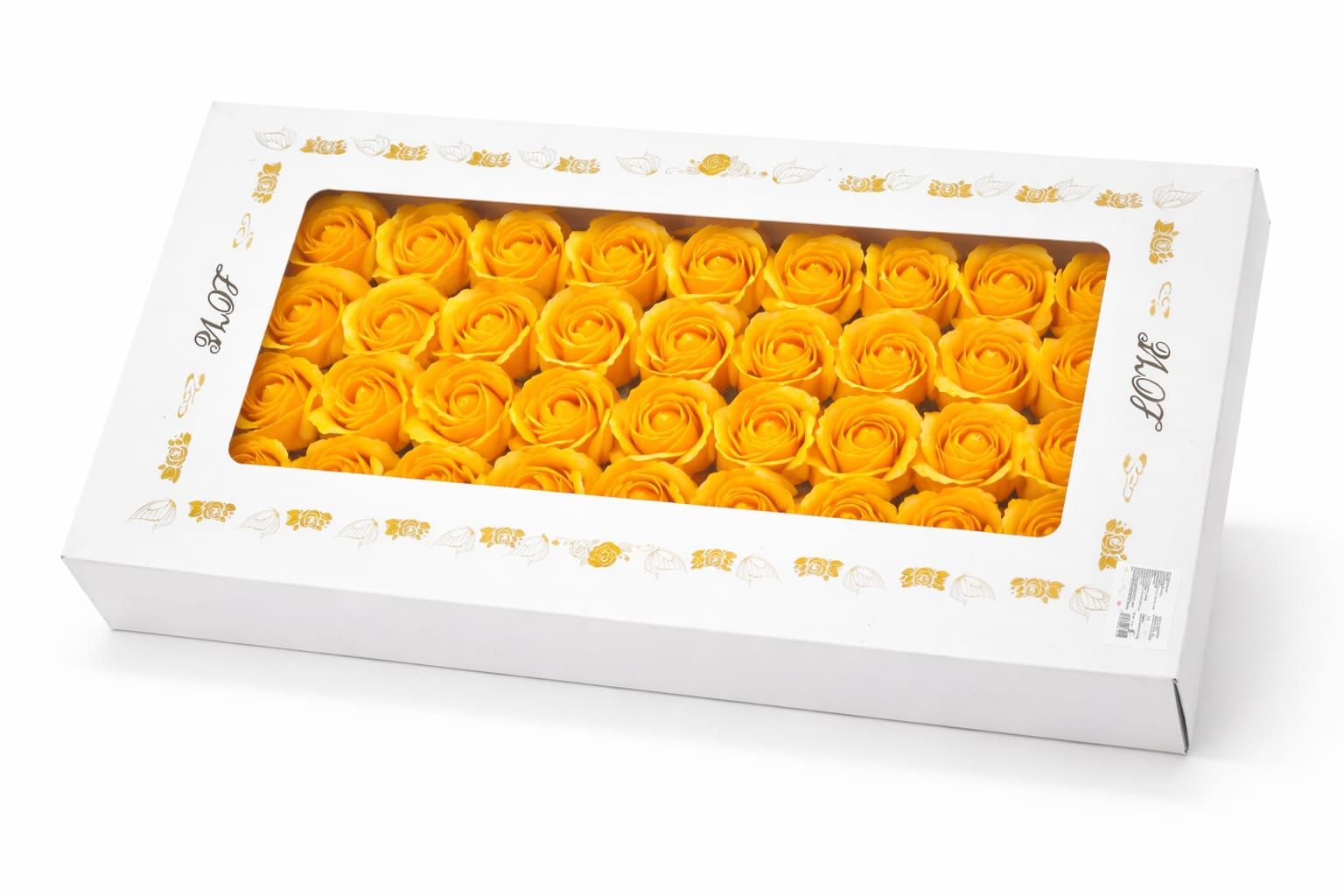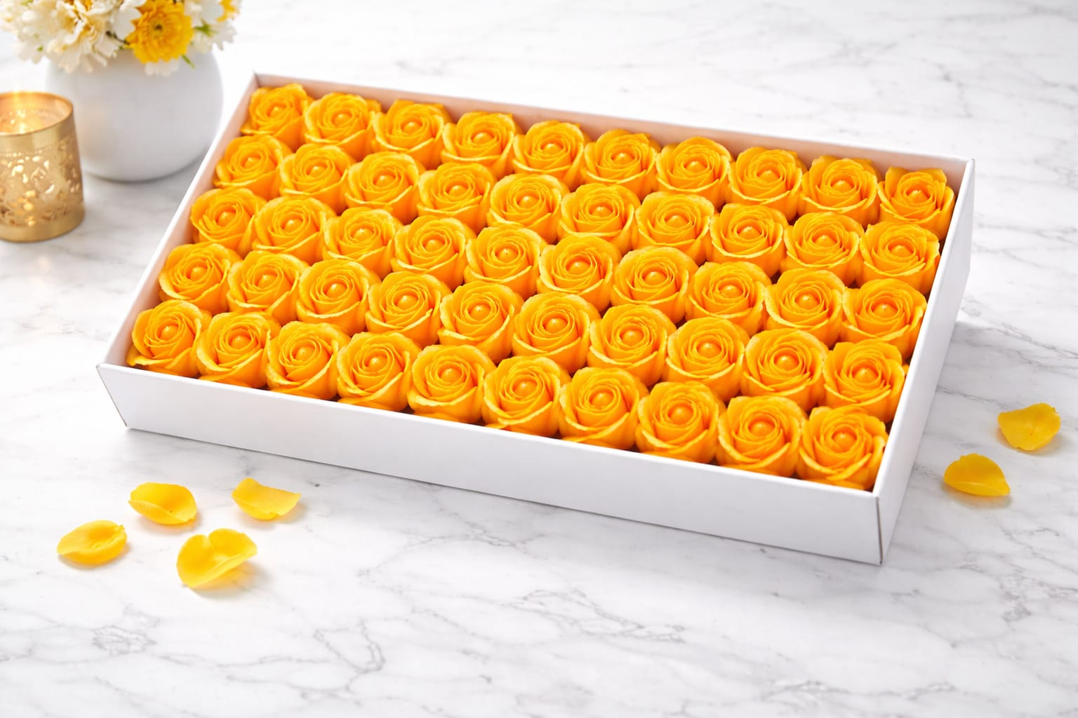 Setul contine 50 de trandafiri de sapun parfumati, aranjati uniform intr-o cutie dreptunghiulara eleganta, ideala pentru a fi oferita cadou. Trandafirii sunt realizati din sapun decorativ, cu un aspect realist si o culoare galbena vibranta, care transmite energie, bucurie si rafinament.