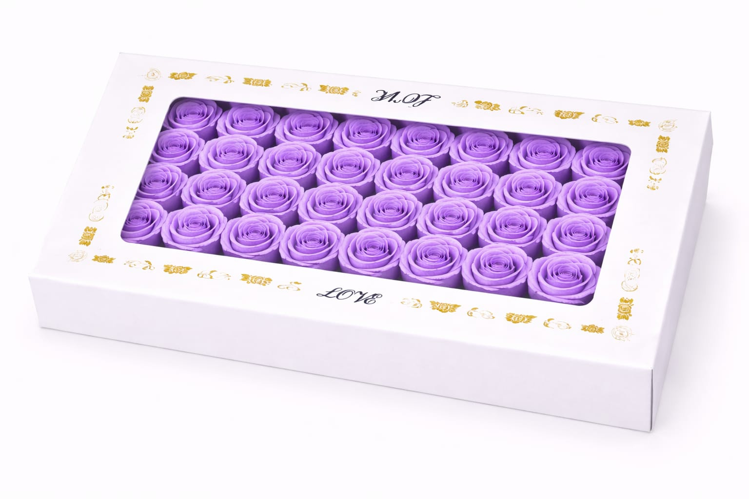 Fiecare trandafir are o inaltime de aproximativ 5 cm, iar dimensiunea cutiei este de 44 x 23 cm, oferind o prezentare ordonata si un impact vizual deosebit. Setul este potrivit pentru aniversari, evenimente speciale, cadouri premium, decor interior sau ocazii festive.