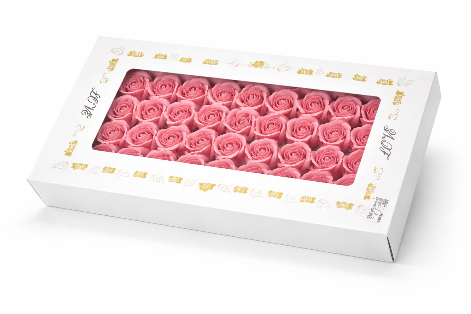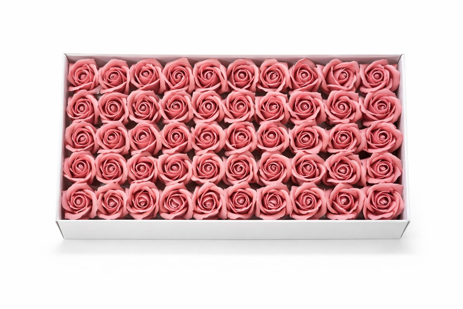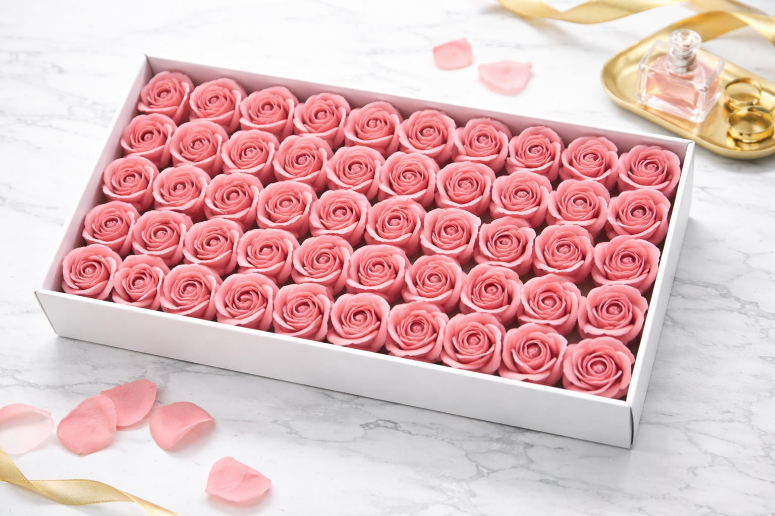 Setul este compus din 50 de trandafiri de sapun parfumati, aranjati atent intr-o cutie dreptunghiulara eleganta, ideala pentru cadouri speciale. Trandafirii au un aspect realist si o culoare roz delicata, simbol al elegantei, afectiunii si rafinamentului.
