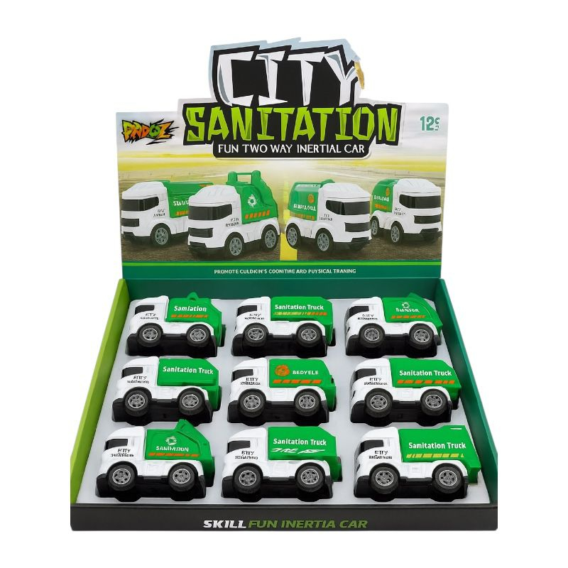 Setul City Sanitation contine 9 masini de gunoi mecanice, perfecte pentru micii pasionati de utilaje si jocuri de rol. Camioanele de salubritate au mecanism cu inertie (pull back & go): le tragi usor inapoi si pornesc singure inainte, fara baterii. Fiecare masina de gunoi jucarie are caroserie alb-verde, roti rezistente si detalii de reciclare, ideale pentru a-i invata pe copii despre curatenia orasului. Dimensiune masina: aprox. 8–9 cm. Material: plastic de calitate, non-toxic. Recomandat de la 3 ani in sus. Perfect pentru cadou, gradinite sau joaca in colectiv – un singur set aduce 9 camioane de gunoi gata de cursa si de strans “murdaria” din toata casa.