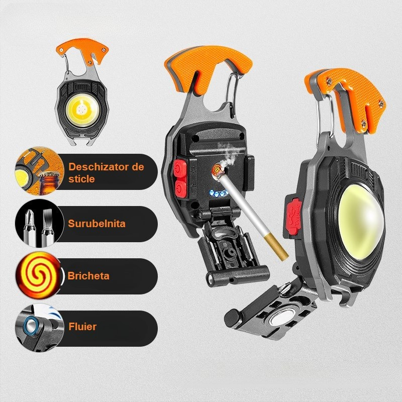 Functii: Lanterna, deschizator de sticle, bricheta, taietor, fluier de supravietuire, magnetic, surubelnita, cutit