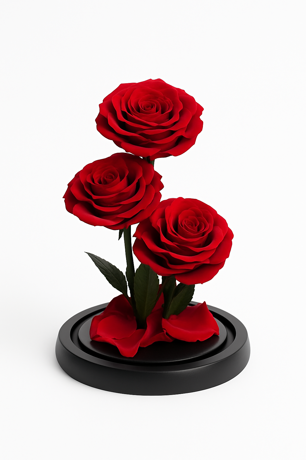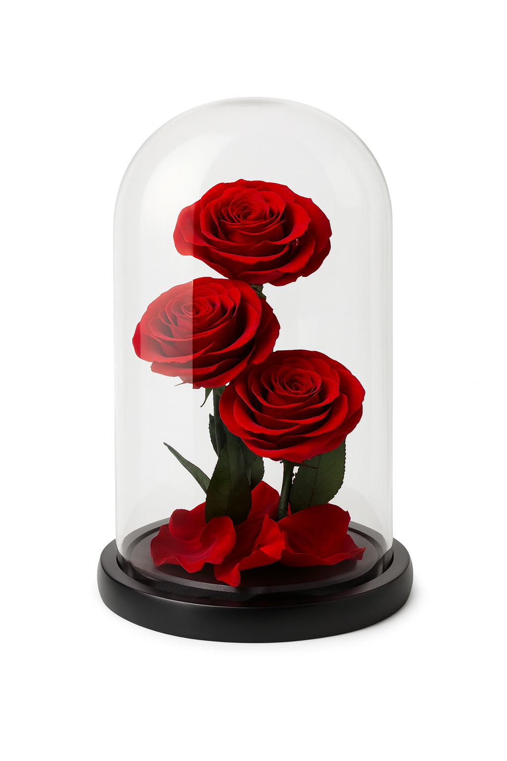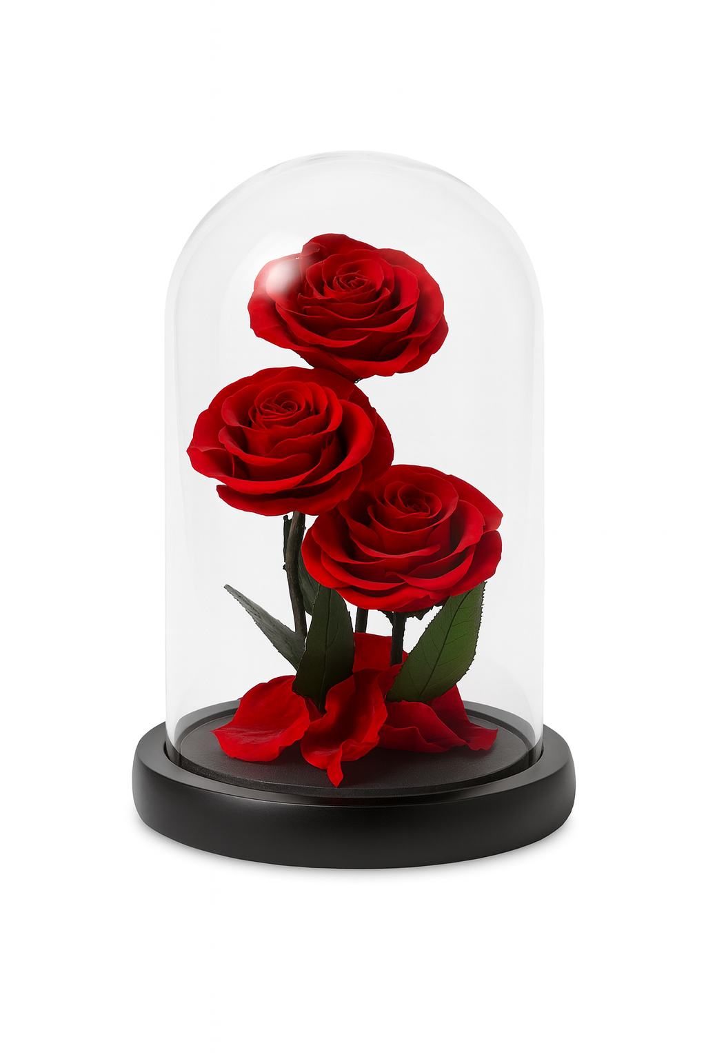 Un cadou care nu se ofileste niciodata și spune „Te iubesc” intr-un mod sofisticat: acest aranjament cu 3 trandafiri criogenati rosii, protejati sub o eleganta cupola de sticla, devine instant o piesa decorativa cu impact emotional puternic.