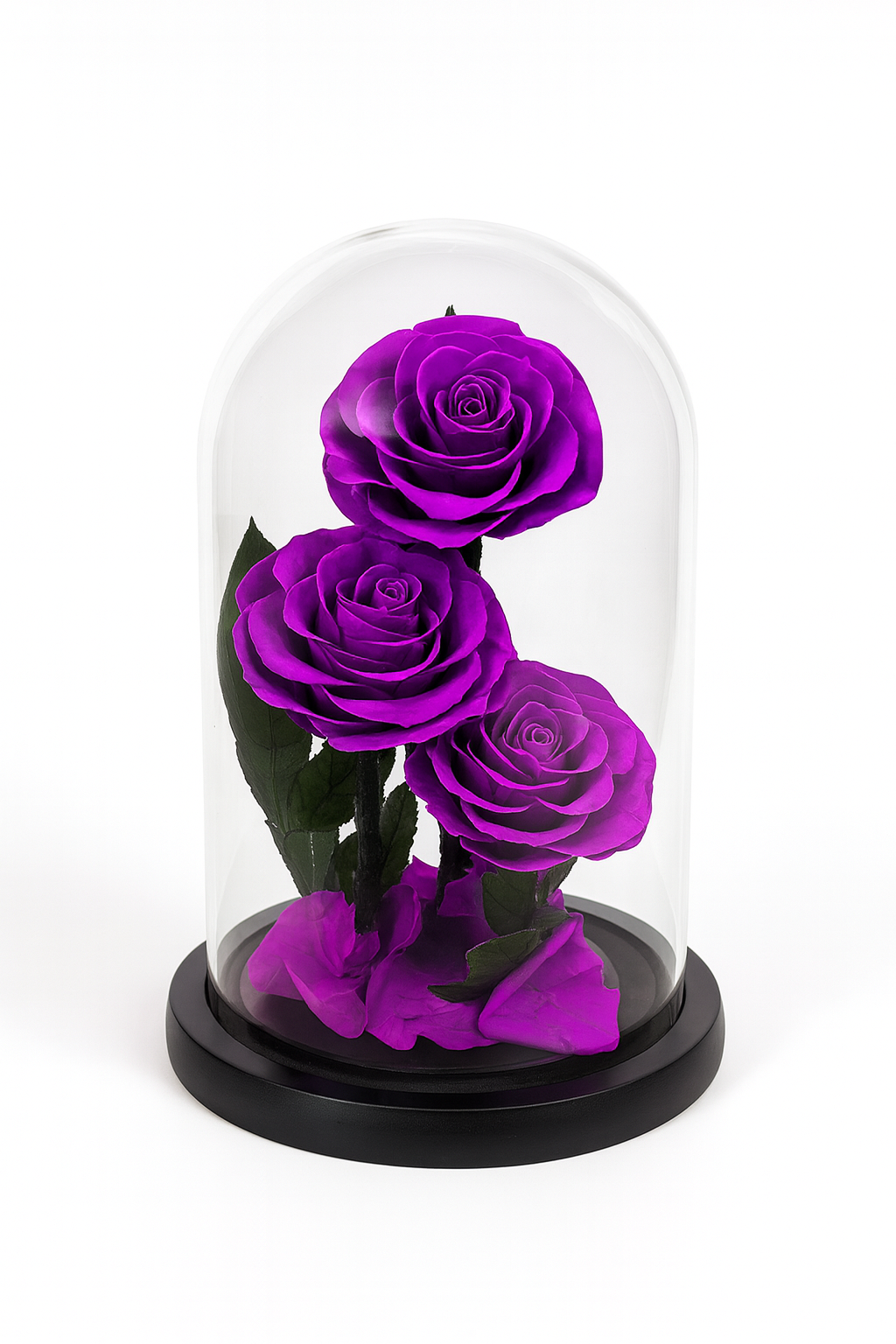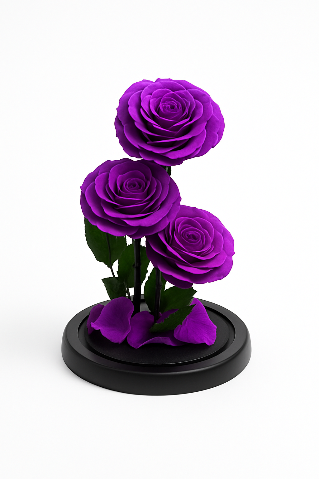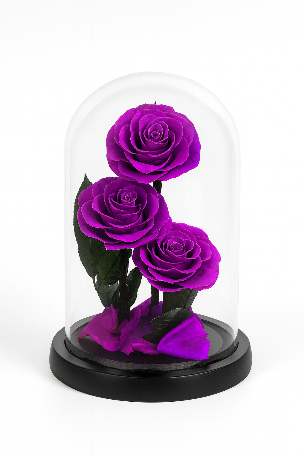 Transforma orice moment intr-o declaratie de iubire cu acest aranjament exclusivist de trandafiri mov criogenati, prezentati intr-o cupola eleganta din sticla. Cele trei flori atent conservate pastreaza prospetimea și textura petalelor pentru ani intregi, oferind un cadou memorabil si rafinat.