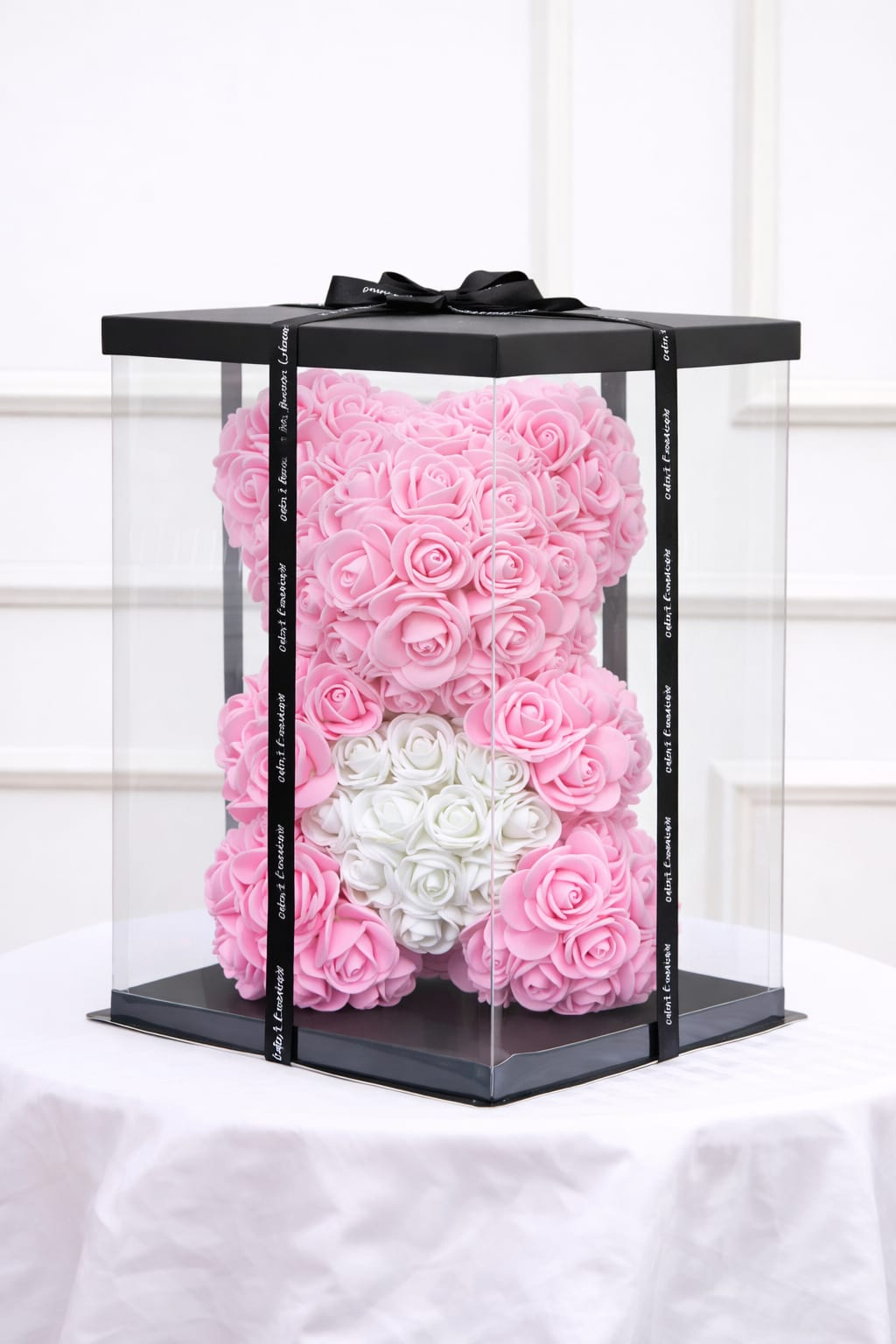 Ursulet decorativ realizat integral din trandafiri artificiali din spuma, atent modelati pentru un aspect uniform si delicat. Designul imbina trandafiri roz deschis cu o inima centrala alba, creand un contrast elegant si un efect vizual armonios. Produsul este conceput ca piesa decorativa premium, ideala pentru cadouri romantice si ocazii speciale.