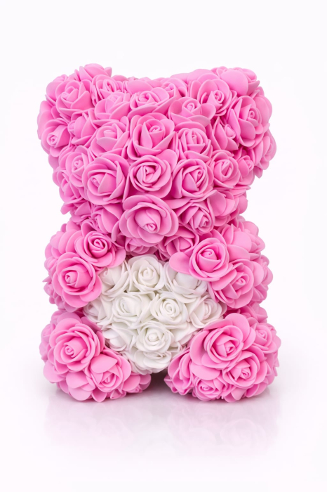 Ursulet decorativ realizat integral din trandafiri artificiali din spuma, atent modelati pentru un aspect uniform si elegant. Designul imbina trandafiri roz intens cu o inima centrala alba, creand un contrast delicat si un efect vizual deosebit. Produsul este conceput ca piesa decorativa premium, ideala pentru cadouri romantice si ocazii speciale.
